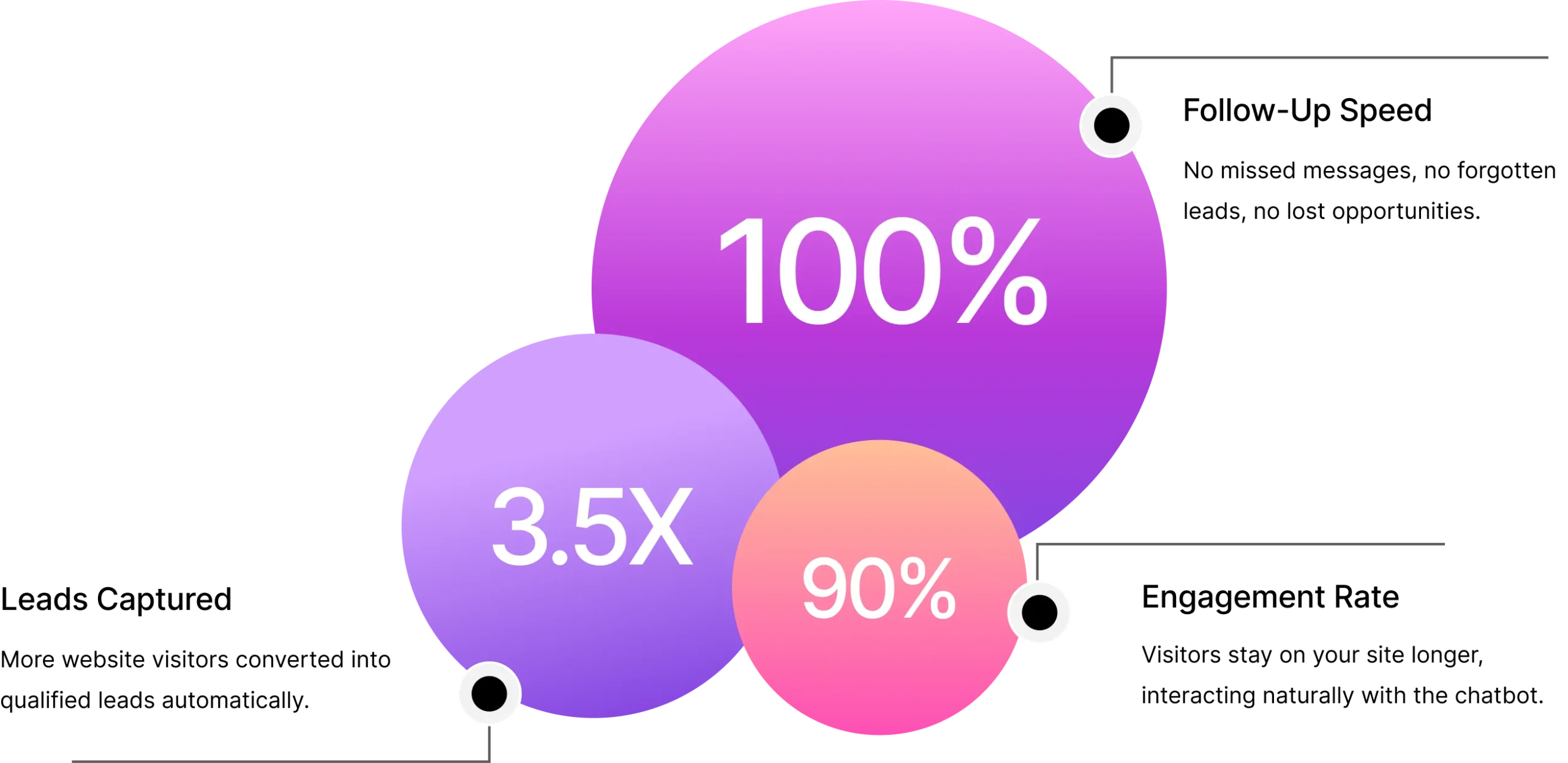 Your chatbot doesn’t sleep, take breaks, or miss messages. It works 24/7 to greet visitors, qualify leads, and keep conversations moving forward.